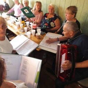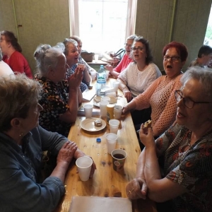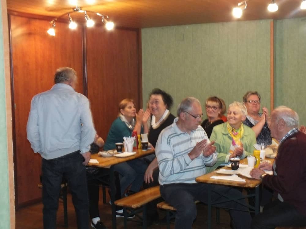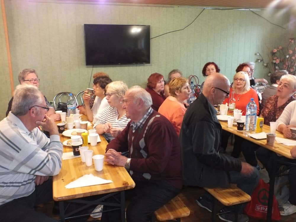 Z-ca Burmistrza, pani Katarzyna Łuczyńska wręczyła zebranym drobne upominki. Pogoda dzisiaj nam nie sprzyjała dlatego grupa zrezygnowała ze spacerów i udała się do M-GOK, gdzie zasiadła do stołów. Podczas poczęstunku nie zabrało rozmów, wspólnego śpiewania oraz dobrego humoru.